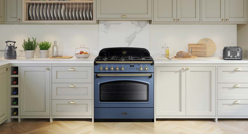 Another traditional inspired design is the Classic Deluxe with its bevelled doors, arched glass viewing windows, towel rail and chunky knobs and handles. It can even be converted to LPG if you don’t have mains gas but want the ease and controllability of this fuel. Take your pick from 90cm, 100cm and 110cm widths as well as Mineral Green, Stone Blue, Cranberry, Black, Cream, Slate, Olive Green, Regal Blue, Racing Green, White or Royal Pearl palettes.