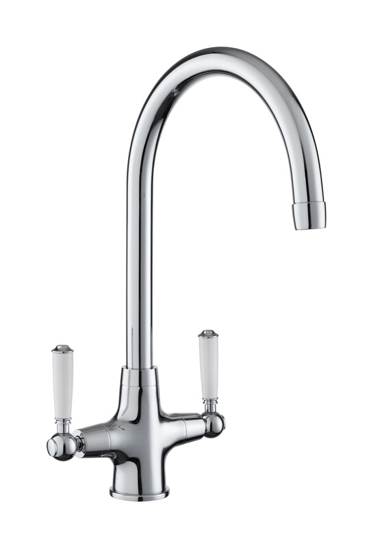 The Aquaclassic dual lever tap sits seamlessly within a traditionally styled kitchen, complementing a ceramic kitchen sink perfectly.