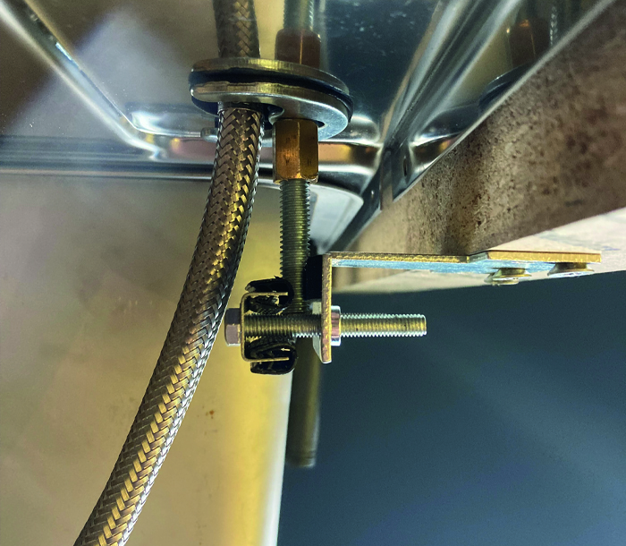 Stability is achieved by attaching one side of the stability bracket to the fixing stud(s) of the tap and the opposite end to the underside of the worktop.